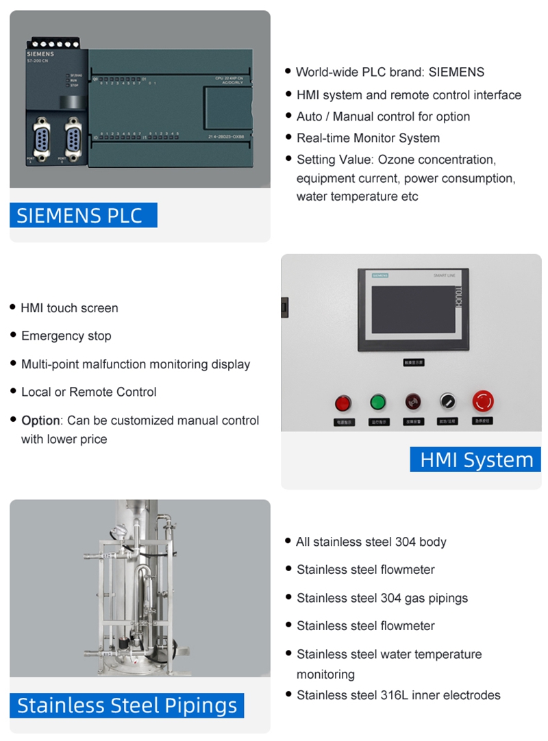The system is controlled by a SIEMENS PLC with an HMI touchscreen for real-time monitoring and local/remote operation. It features comprehensive stainless steel construction (304 body & pipings, 316L inner electrodes) and includes multi-point fault monitoring, emergency stop, and customizable control options.